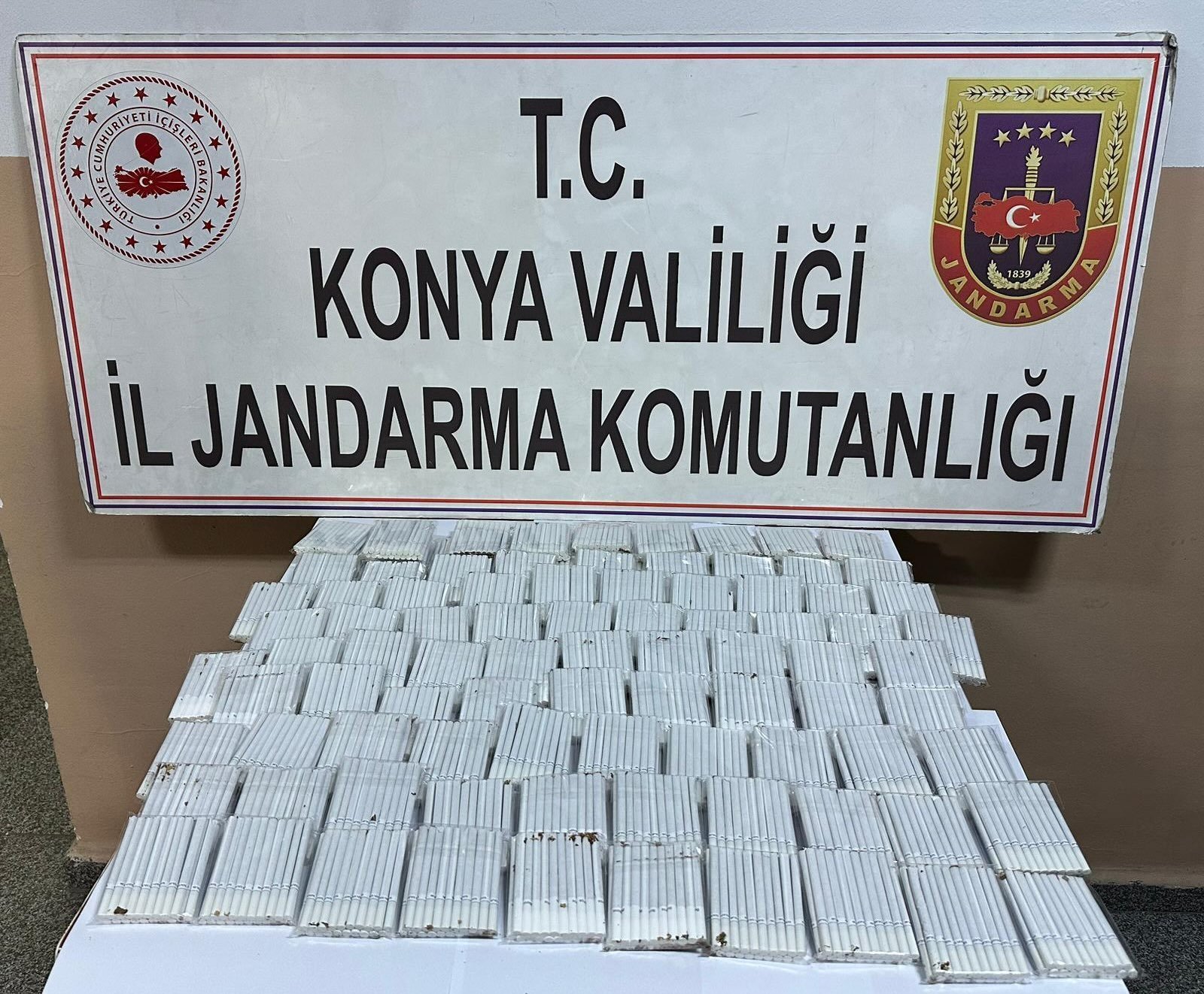 Konya'da jandarma ekiplerince gerçekleştirilen kaçakçılık operasyonunda 113 paket gümrük kaçağı sigara, 22 bin 60 adet içi tütün doldurulmuş makaron, 17 kilogram nargile tütünü ve 300 kilogram kıyılmış tütün ele geçirildi.
