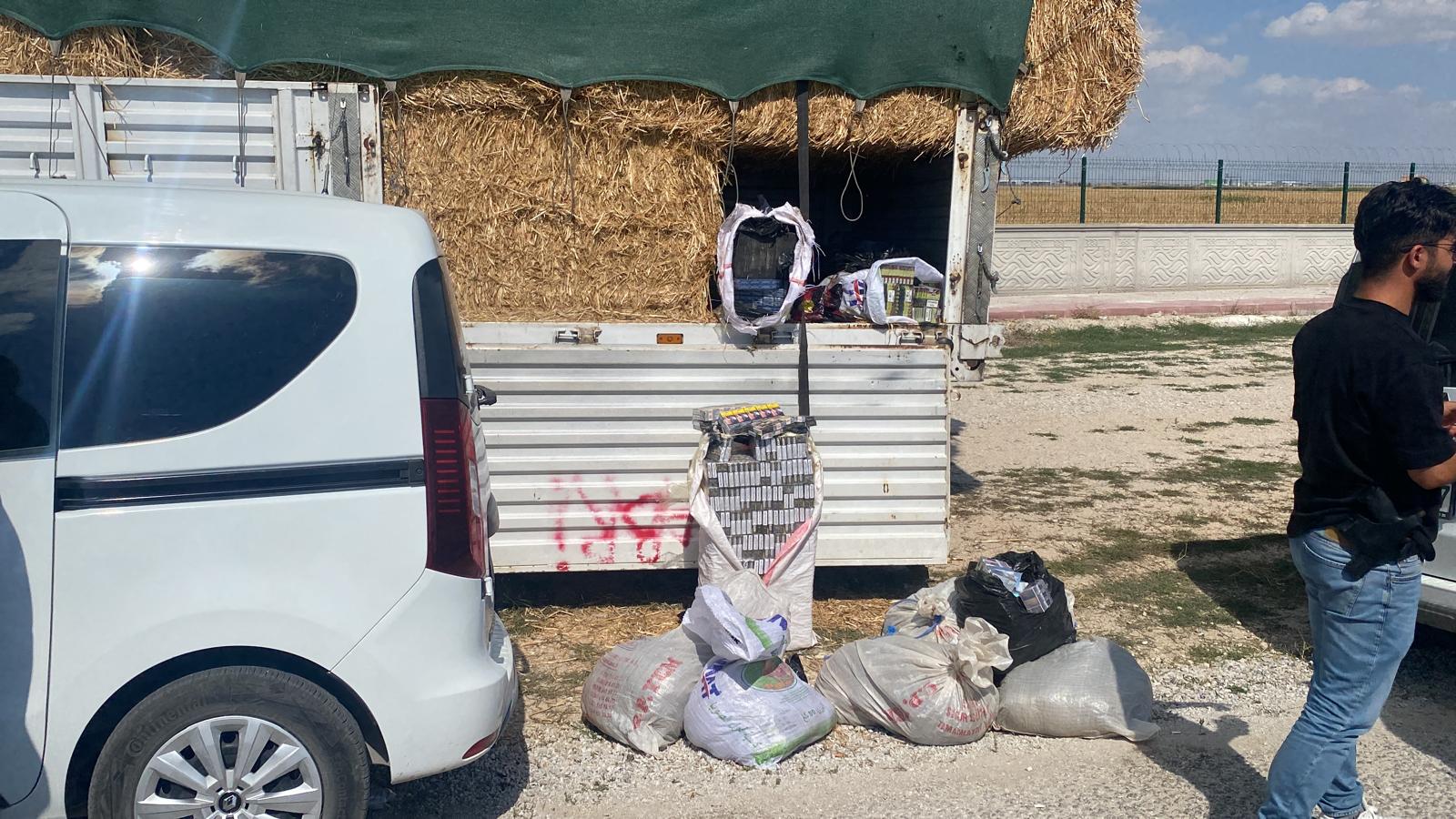 63AHS046 plakalı tır kasasında görünür vaziyette bin 950 paket gümrük kaçağı sigara,158 adet elektronik sigara,237,5 kg nargile tütünü,90 paket puro ele geçirildi.