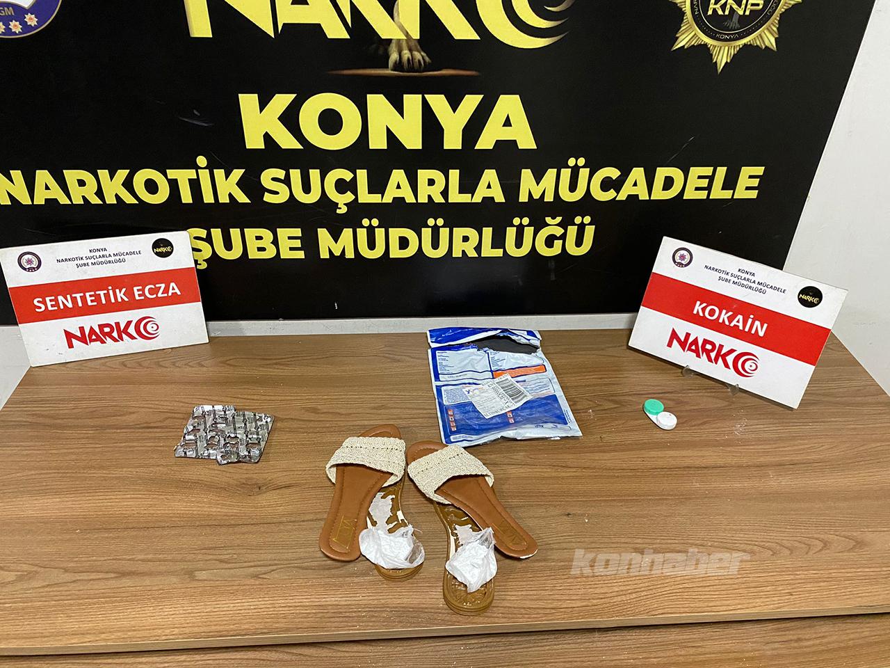 Konya'da tabanına uyuşturucu gizlenen terliği kuryeden teslim alan şüpheli kadın gözaltına alındı.