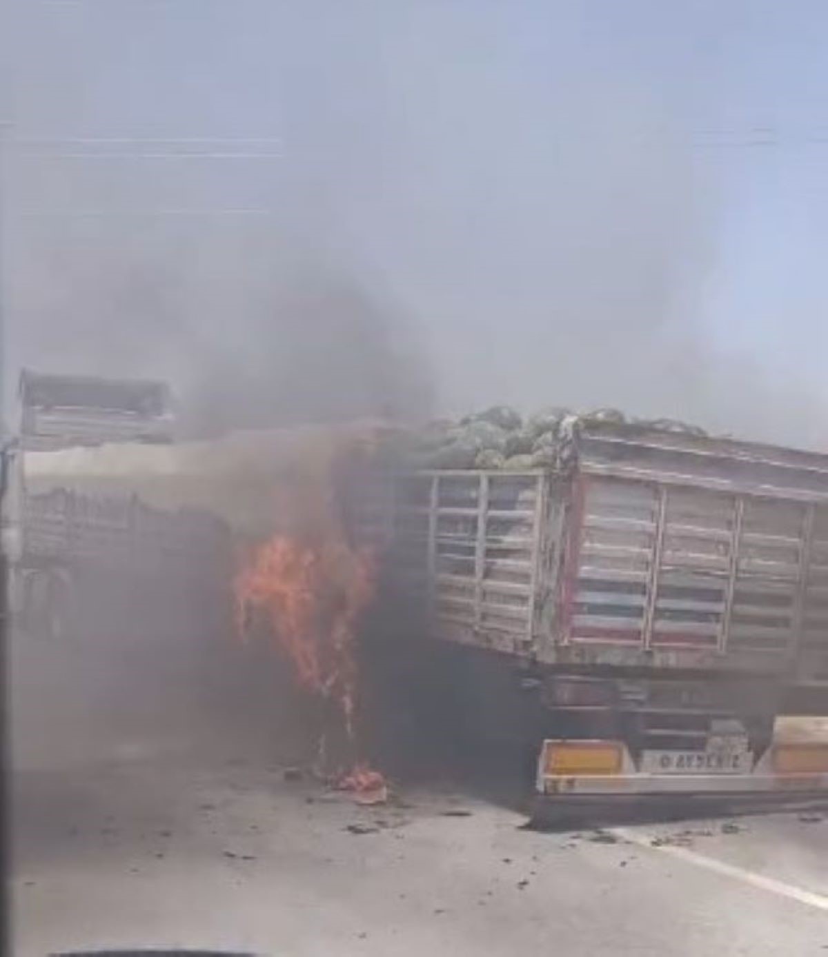 Olay, Zengen Mahallesi yakınlarında meydana geldi. Edinilen bilgiye göre, seyir halinde olan dorsesinde karpuz yüklü tırda yangın çıktı. Dorse lastiğinden yükselen dumanları fark eden tır sürücüsü aracını kenara çekip durdurarak araçtan indi.