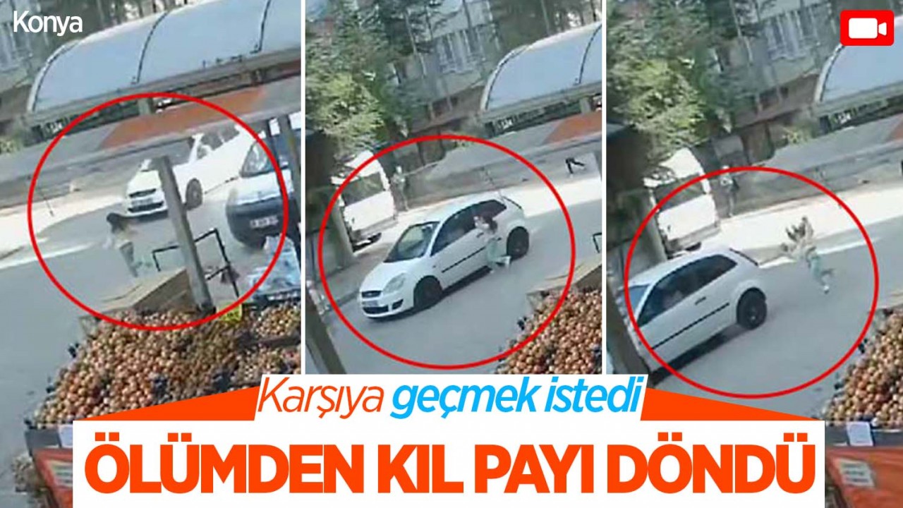 Konya'nın Selçuklu İlçesinde seyir halinde olan otomobil sokak üzerinde karşıya koşarak geçmeye çalışan çocuğa çarptı. O anlar ise bir iş yerinin güvenlik kamerasına yansıdı.