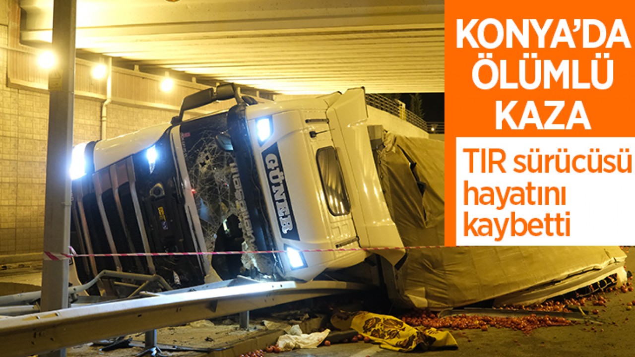 Konya'nın Karapınar ilçesinde domates yüklü TIR'ın devrilmesi sonucu meydana gelen kazada sürücü hayatını kaybetti.