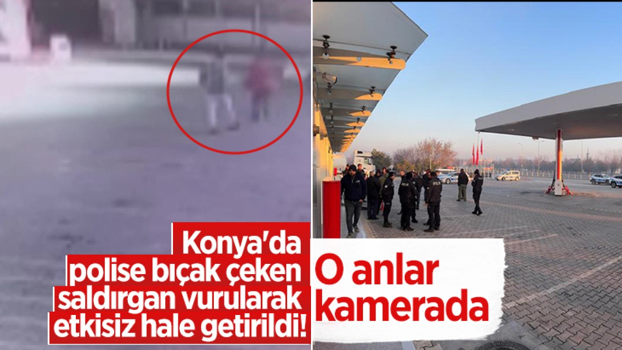 Konya'da kapalı olan marketin kapısını tekmeyle kırıp 2 maden suyu alan, önce kendisine engel olmak isteyen çalışana, ardından da gelen polis ekiplerine bıçakla saldırmak isteyen M.A.B. (20), bacaklarından vurularak yakaladı. Yaşananlar güvenlik kamerasına yansıdı.