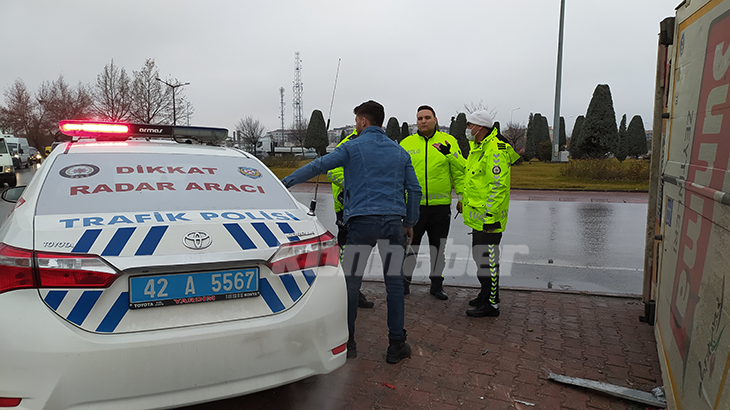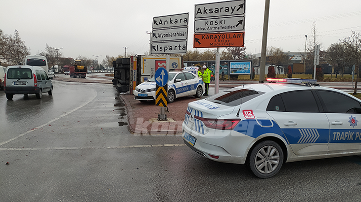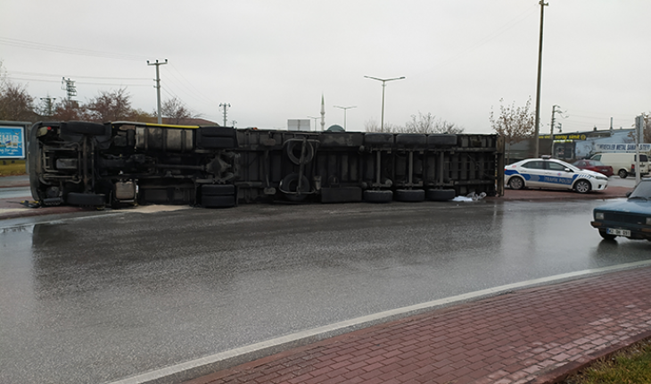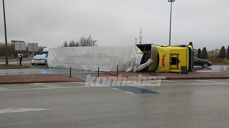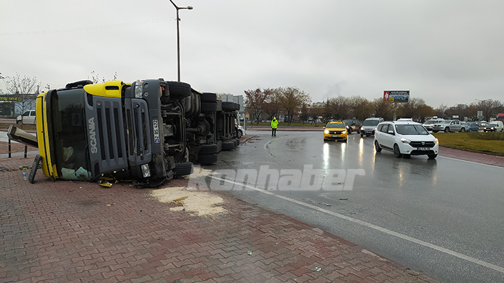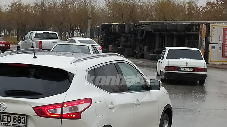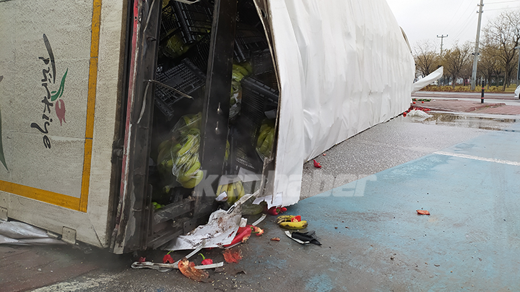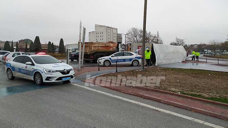 Konya’nın Karatay İlçesinde sebze, meyve yüklü tırın virajı alamayarak devrilmesi sonucu sürücü yaralandı.