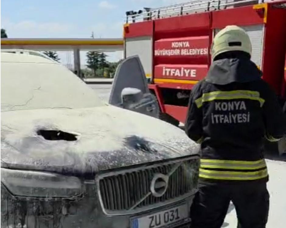 Konya'nın Kulu ilçesinde seyir halinde olan cip yanmaya başladı. Araçta çıkan yangını gören istasyon çalışanları yangın tüpleri ile müdahale ederek, faciayı önledi.