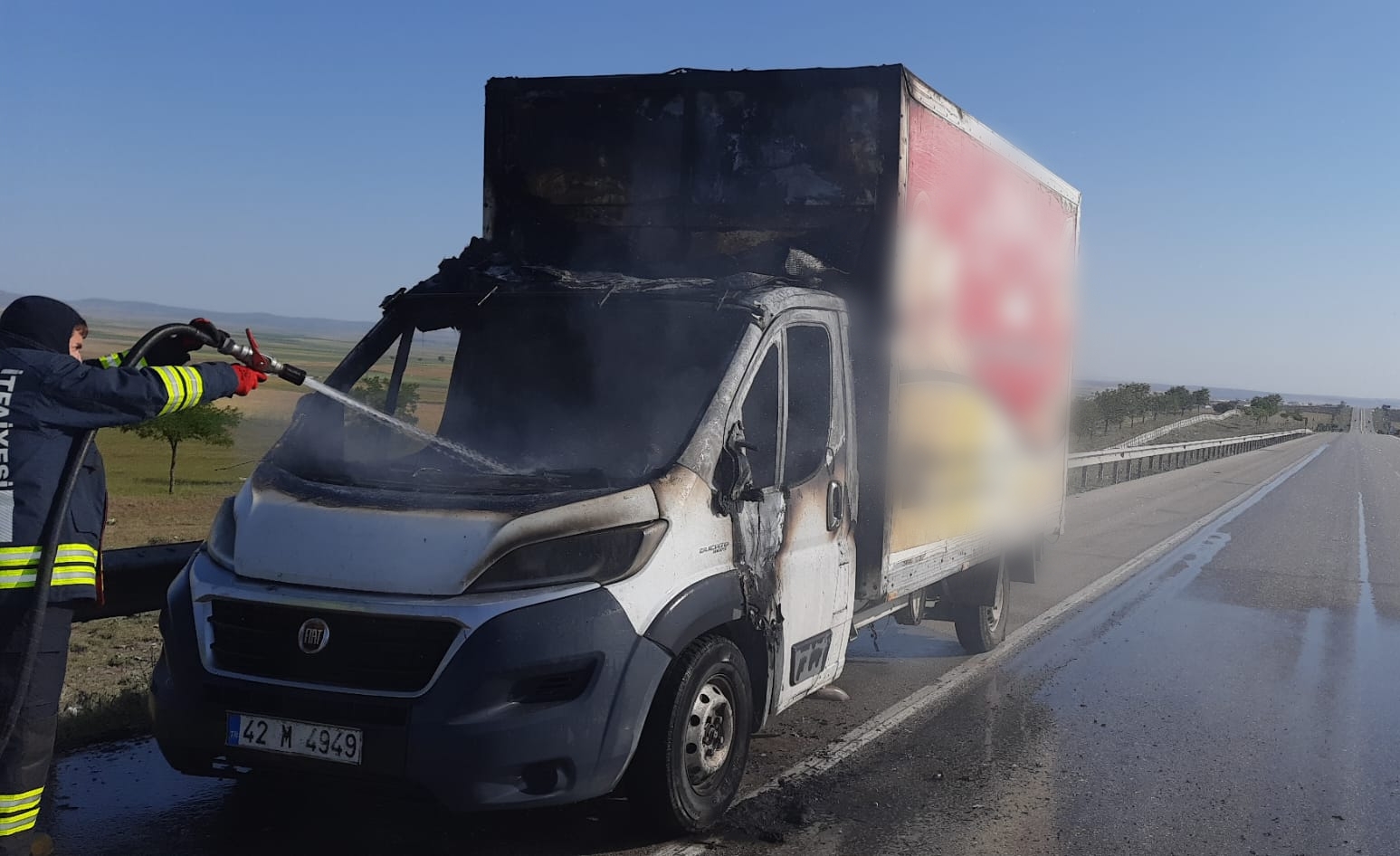 Konya’nın Kulu ilçesinde seyir halindeki kamyonette yangın çıktı. Alevler, itfaiyenin çalışmasıyla söndürüldü.