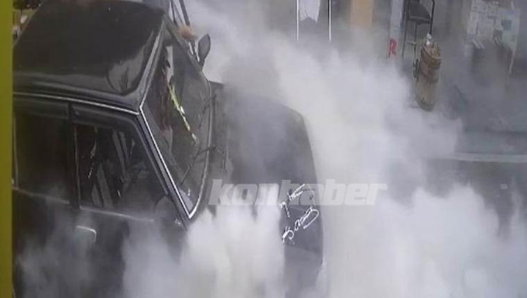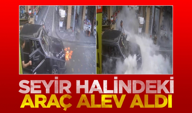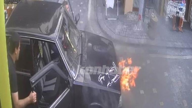 Bu sırada aracın ön bölümünden bir anda alevler yükseldi. Otomobilin motor kısmındaki yangın, çarşıdaki esnafın yangın tüpüyle müdahalesinin ardından büyümeden söndürüldü. LGP'li olan aracın zamanında söndürülmesi ortaya çıkabilecek bir facianın da önüne geçmiş oldu. Otomobildeki yangın, çarşıda bulunan bir iş yerinin güvenlik kamerası tarafından da görüntülendi.