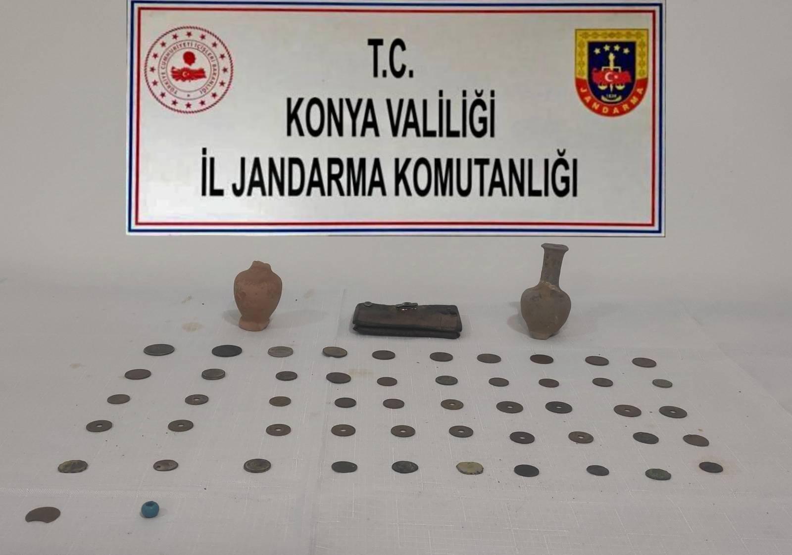 Konya'nın Ilgın ilçesinde jandarma ekiplerince bir şahsın üzerinde ve ikametinde yapılan aramada 51 sikke ve 2 adet tarihi eser obje ele geçirildi.