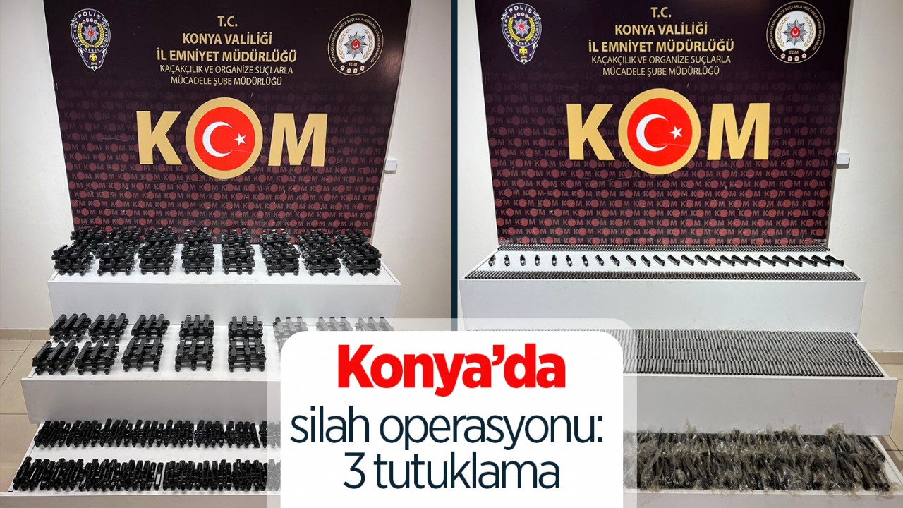 Konya'da KOM ekipleri tarafından düzenlenen silah operasyonunda, tabancalar ve çok sayıda tabanca yapımında kullanılan parça ele geçirilirken, 3 şüpheli tutuklanarak cezaevine gönderildi.