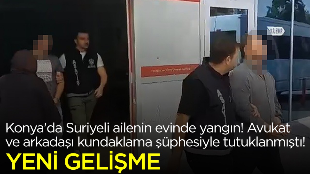 Belirlenen araç sahibi Konya Barosuna kayıtlı Avukat Erdoğan Varım (26) ile arkadaşı 24 yaşındaki Emir İner gözaltına alınarak ifadesi alınmak üzere emniyete götürüldü. Avukat Erdoğan Varım'ın kundaklanan evde oturan Suriye uyruklu Mustafa Igeydi ile dosya getirmesi karşılığında komisyon vererek anlaştığı, son zamanlarda dosya ücreti nedeniyle aralarında çıkan tartışmaların sonrası husumet çıktığı iddia edildi. Emniyetteki işlemlerinin ardından adliyeye sevk edilen Erdoğan Varım ve Emir İner çıkarıldıkları mahkemece 'mala zarar verme' suçundan tutuklandı.