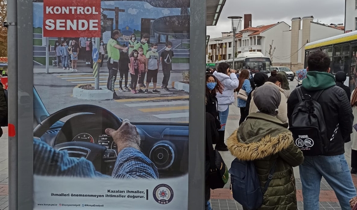 Konya Emniyet Müdürlüğü, trafik kazalarını önlemek, yayaları ve sürücüleri bilinçlendirmek için şehrin reklam panolarına yaya geçidi ve emniyet kemeri konulu afişler astı.