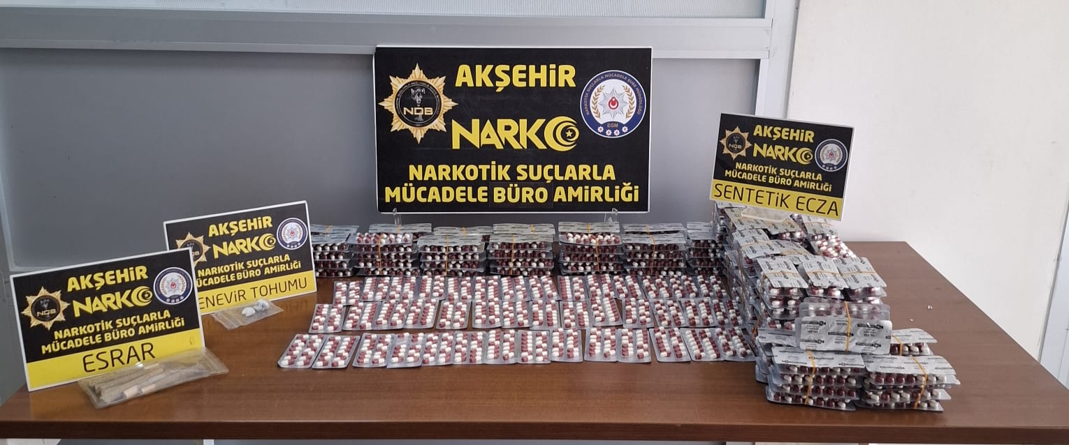 Konya Narkotik Suçlarla Mücadele Şube Müdürlüğü ekipleri, uyuşturucu sevkiyatı yapabileceğinden şüphelenilen bir kişinin tespit edilmesi üzerine Akşehir İlçe Emniyet Müdürlüğü ile koordineli bir operasyon düzenledi.Ekipler, şüphelinin yolcu olarak bulunduğu şehirler arası otobüsü durdurarak arama yaptı. Yapılan üst ve eşya aramasında, şüpheli İ.Ş.'ye ait valizde 5.300 adet uyuşturucu hap, 28,92 gram esrar ve 2,16 gram kenevir tohumu ele geçirildi. Uyuşturucu maddelere el konulurken, şüpheli gözaltına alındı.