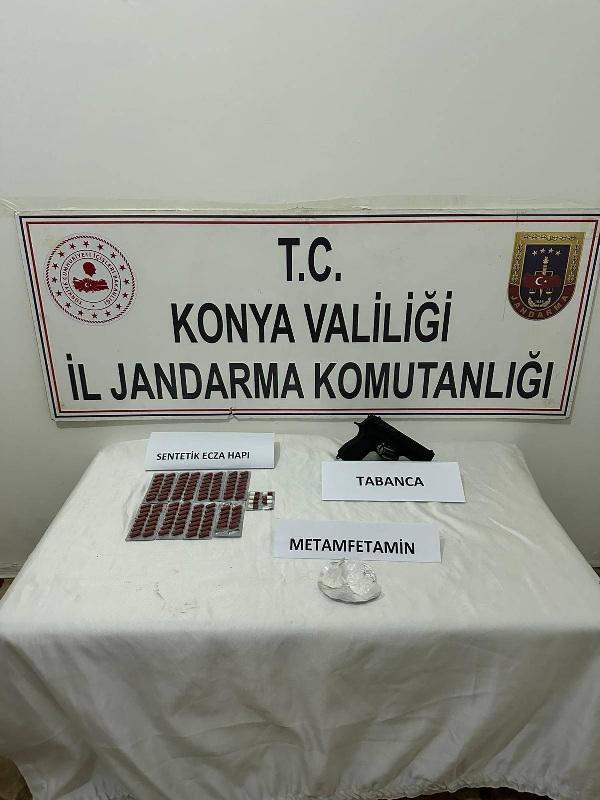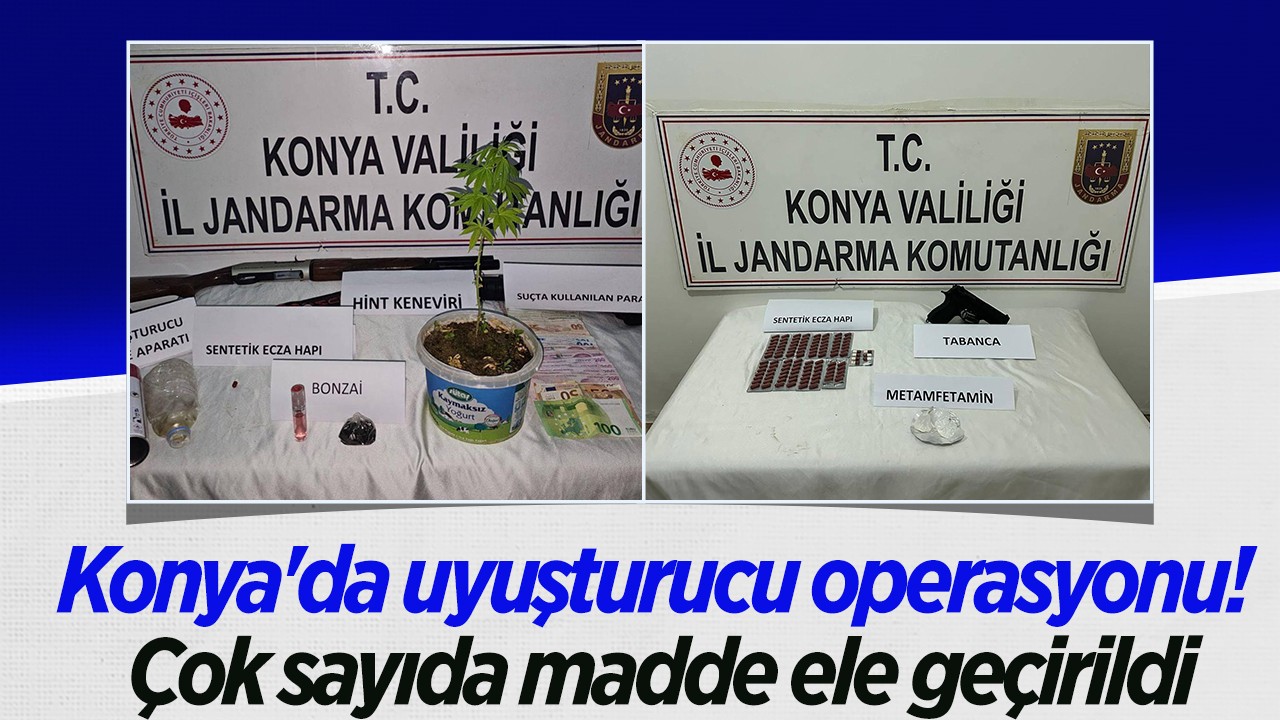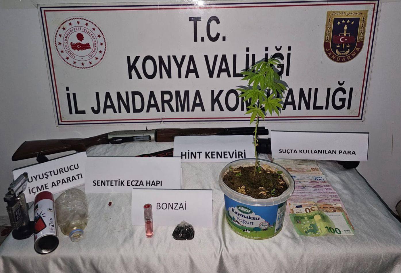 Jandarma ekiplerince Konya'nın Çumra ilçesinde suç ve suçluluk faaliyetlerinin önlenmesine yönelik sürdürülen çalışmalar kapsamında çok sayıda uyuşturucu madde ele geçirildi.