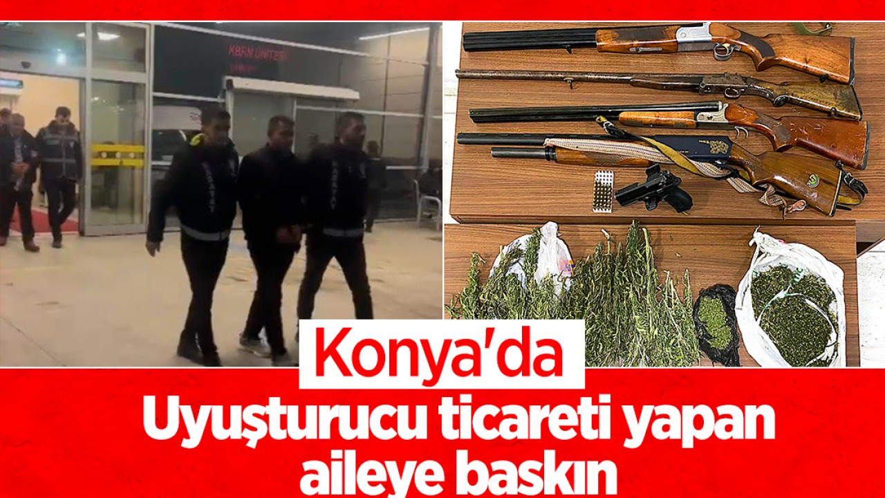 Konya'da polis ekipleri, evlerinde uyuşturucu ticareti yaptığı iddia edilen bir ailenin adresine baskın yaptı. Baskında 6 adet tüfek, 1 adet tabanca ve 1 kilogram 135 gram esrar ele geçirildi.