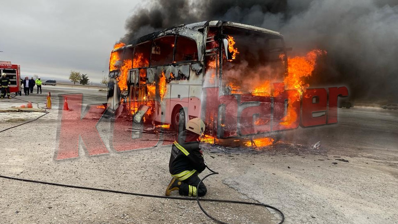 Konya’nın Ereğli ilçesinde seyir halinde olan yolcu otobüsü alev aldı. Yangında ölen ya da yaralanan olmazken, otobüs hurdaya döndü.