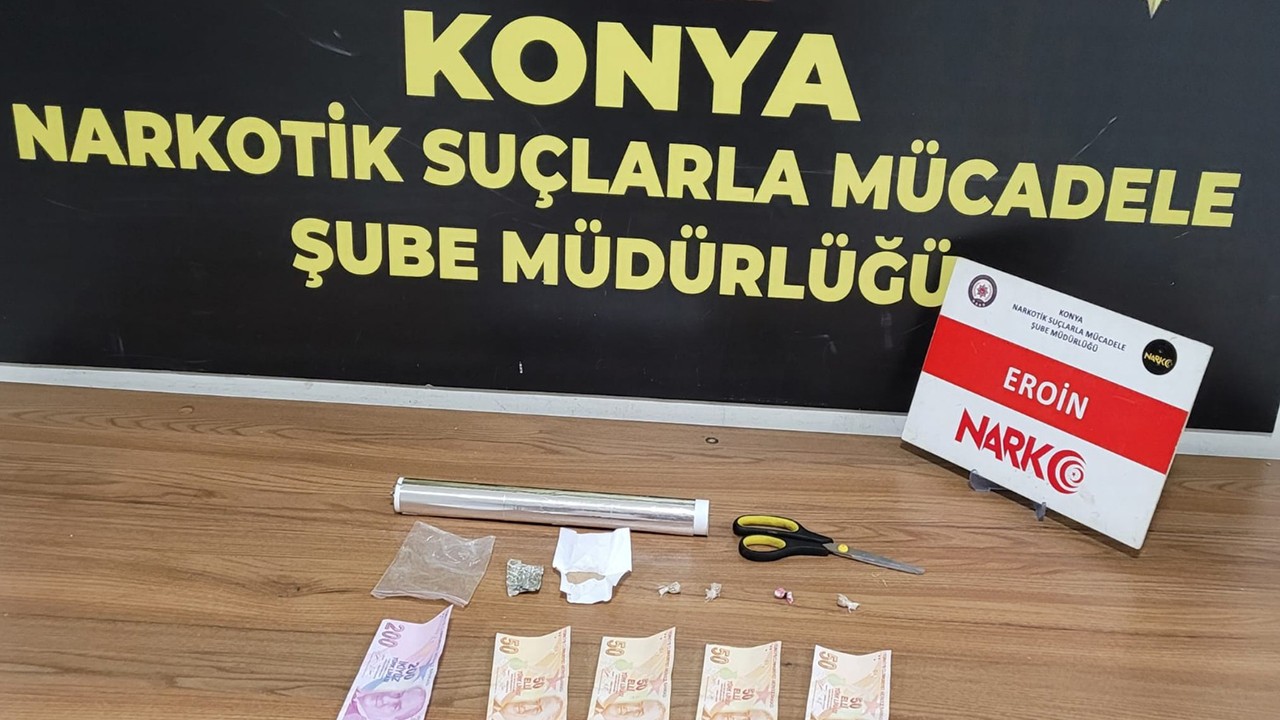 Meram ilçesi Çaybaşı Mahallesi’nde bulunan iş yerine ulaşan ekipler iş yeri içerisinde bir kadın şahsı uyuşturucu kullanırken yakaladı. K.Ç. isimli kadın şahsın üzerinden bir miktar eroin çıkması üzerine iş yeri içerisinde arama gerçekleştiren ekipler bir miktar daha eroin maddesine ulaştı. Şüpheli iş yeri sahibi M. Ö. ve uyuşturucu kullanıcısı kadın gözaltına alınırken eroin maddesi ve uyuşturucudan elde edilen bir miktar paraya el konuldu.