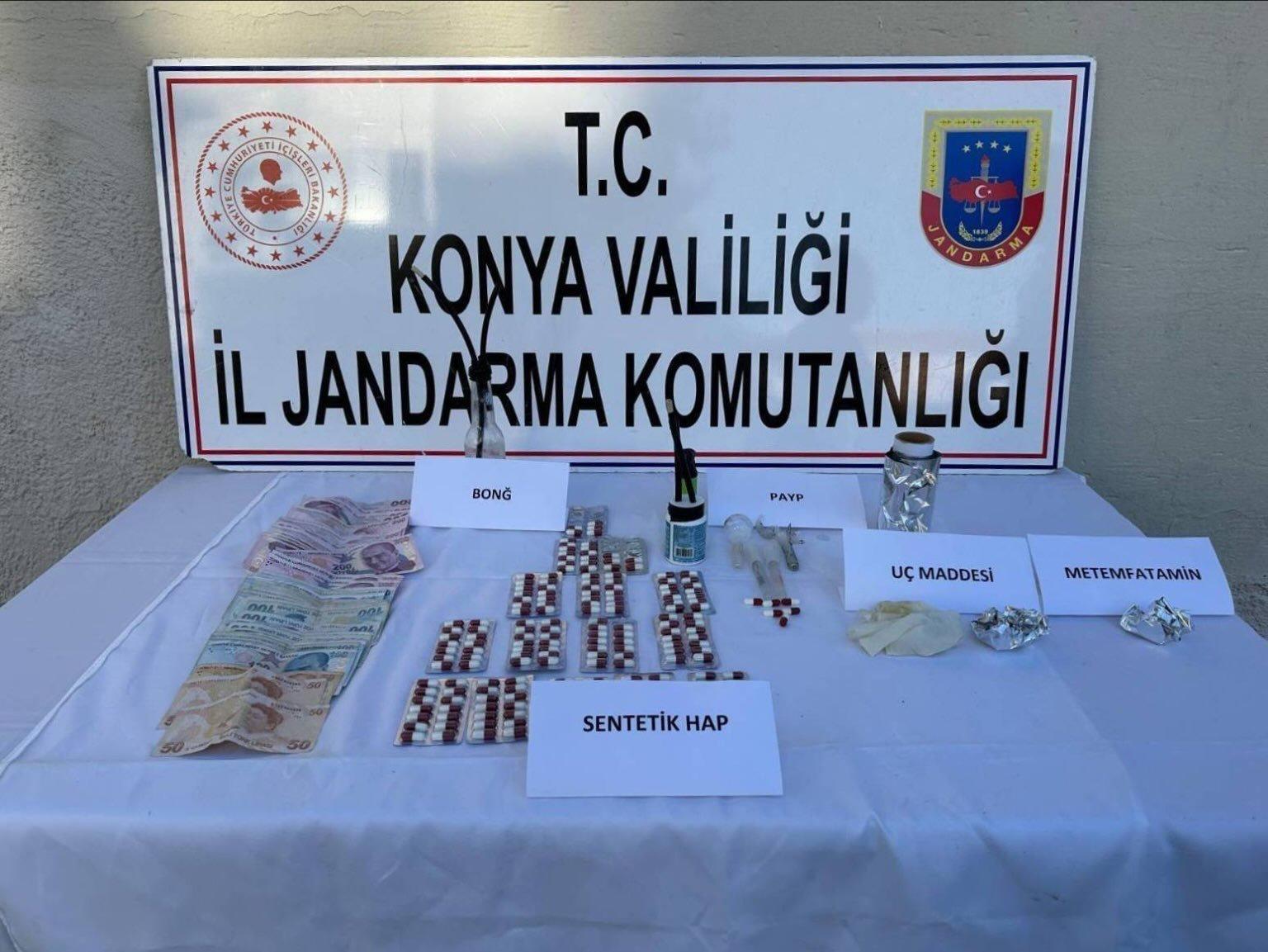 Ereğli ilçesinde jandarma ekiplerince yapılan istihbari çalışmalar neticesinde 1 şahsın iş yerinde arama yapıldı. Yapılan aramada 196 adet sentetik ecza hapı, 2 gram metamfetamin, 3 gram bonzai ve 6 adet uyuşturucu içme aparatı ile 7 bin 50 TL para ele geçirildi.