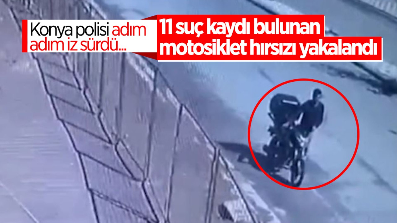 Konya'da son bir hafta içerisinde 3 motosiklet çalan şahıs polis ekiplerince yakalandı. Şüpheli şahsın11 adet suç kaydı olduğu ve cezaevi firarisi olarak arandığı ortaya çıktı.