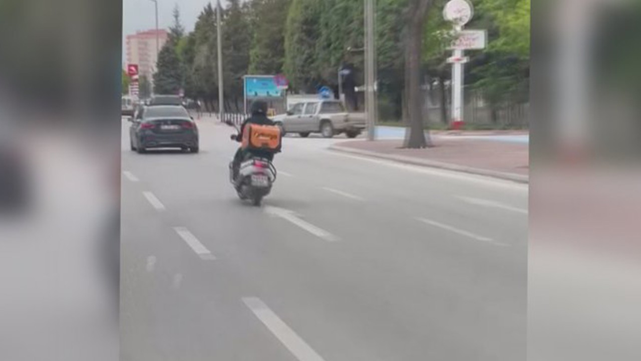 Ankara Caddesinde şehir merkezine doğru ilginç hareketler yaparak ilerleyen motosikletli kurye diğer sürücülerin dikkatini çekti.