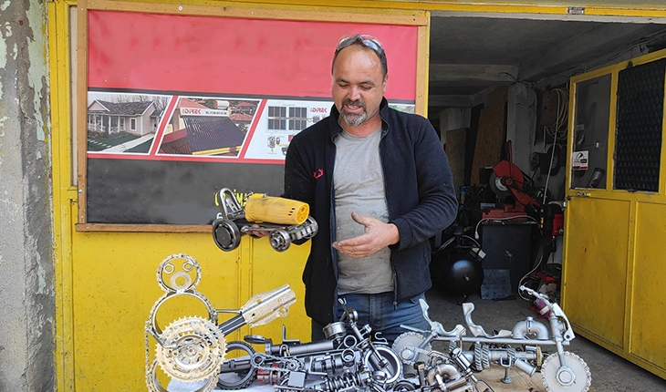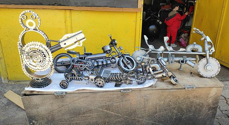 Direk, 30 metrekarelik atölyesinde somun, vida, zincir gibi metal artıkları da sanat eserine dönüştürüyor. Yalnız çalışan Direk, yarış motorları, klasik motosikletler, traktörler, gitar çalan adam figürü, makaralı sistemle kuyudan su çeken adam, kaynak yapan adam, kaplumbağa, örümcek ev eşyaları, bilgisayarda ders çalışan öğrenci gibi maketler yapıyor.