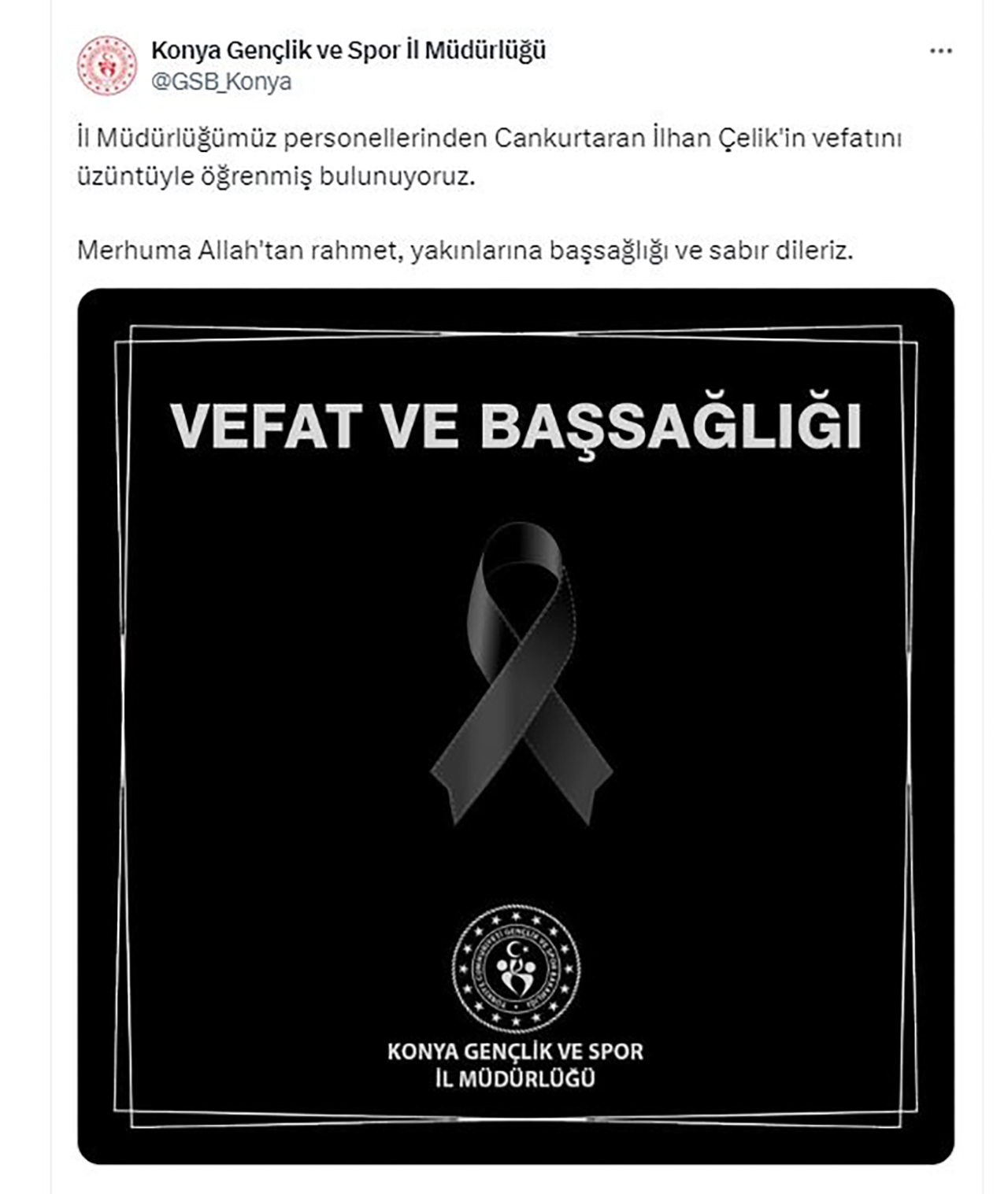 Konya Gençlik ve Spor İl Müdürlüğü tarafından yapılan açıklamada ise “ İl Müdürlüğümüz personellerinden Cankurtaran İlhan Çelik'in vefatını üzüntüyle öğrenmiş bulunuyoruz. Merhuma Allah'tan rahmet, yakınlarına başsağlığı ve sabır dileriz” denildi.