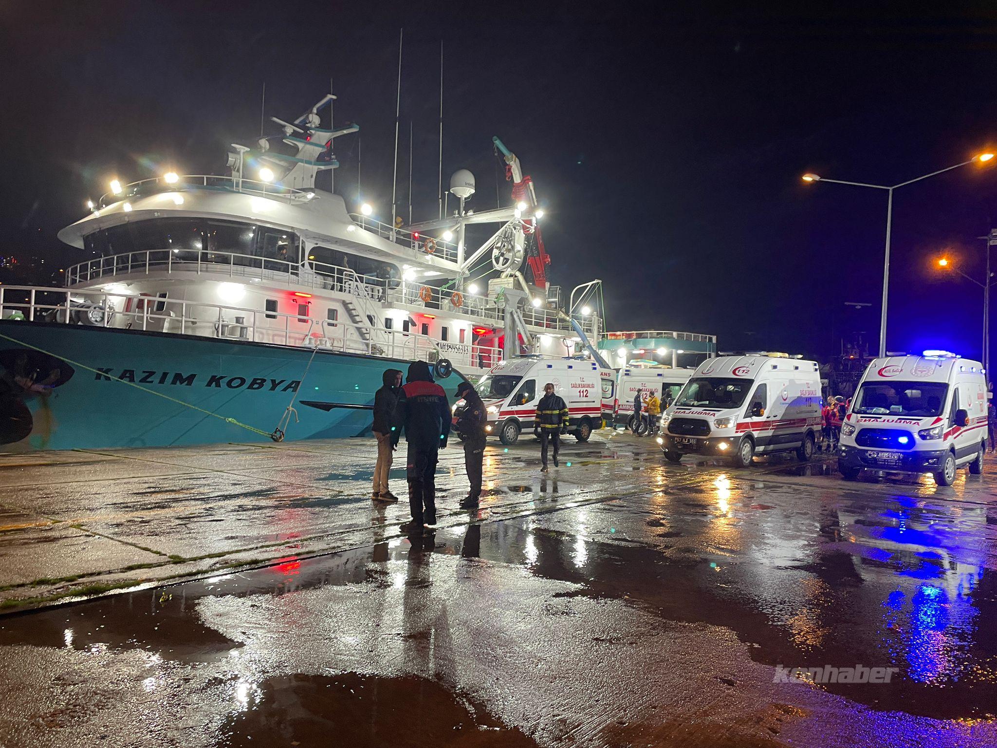 Gemi mürettebatından 16 kişi balıkçı teknelerinin de yardımıyla Sinop Limanı'na getirildi.