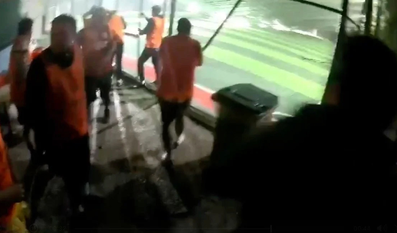 Saha hakkında konuşan futbolcular biranda gelen gürültüyle sahadan koşarak kaçarken, sahayı terk ettikleri anda çatıda çökme yaşandı.