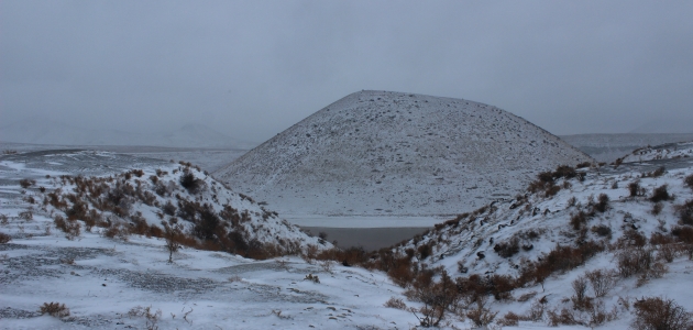 Kurak bir kış mevsiminden sonra Karapınar'a mevsimin ilk karı yağdı.Beyaz örtüsü ile güzel manzaraların oluştuğu Meke Gölü'ne gelen ziyaretçiler, göl manzarasının fotoğrafını çekiyor.