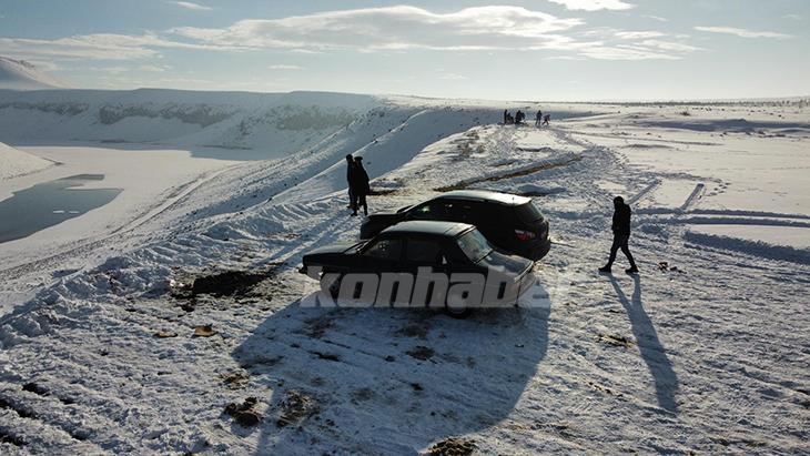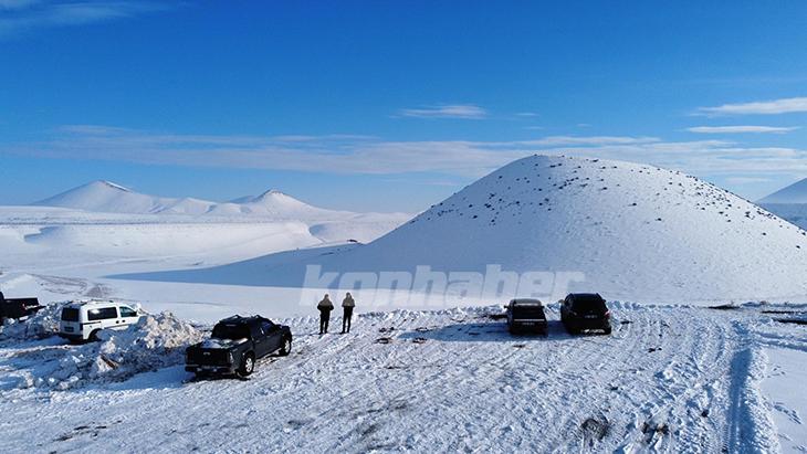 Karapınar'ın en önemli doğal güzelliklerinden birisi olan Meke Krater Gölü, kar yağışının ardından ziyaretçi akınına uğradı.