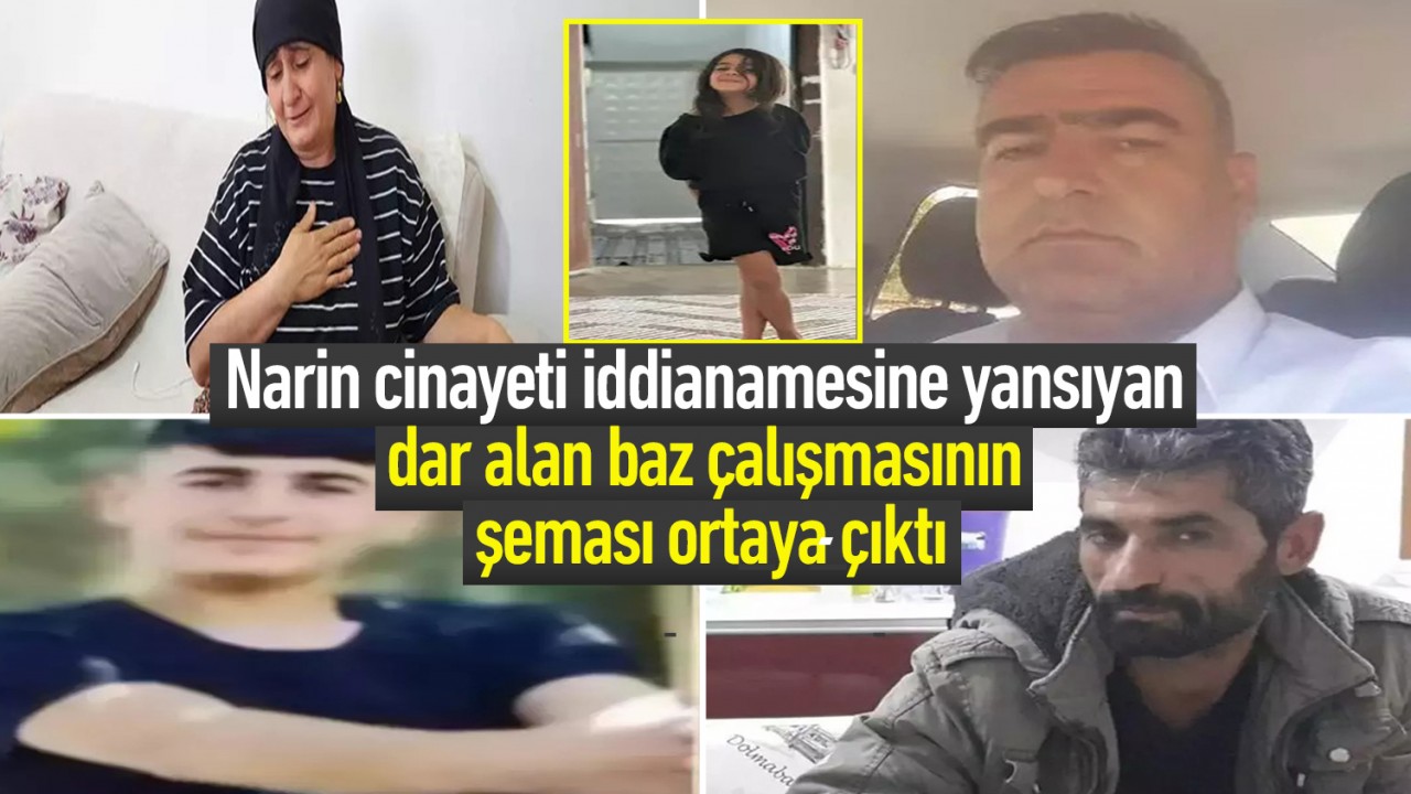 Diyarbakır’ın Bağlar ilçesinde kaybolduktan 19 gün sonra cansız bedeni bulunan Narin Güran (8) cinayetiyle ilgili tutuklu amca Salim Güran, anne Yüksel, ağabey Enes Güran ve cesedi dere yatağına taşıdığı tespit edilen Nevzat Bahtiyar’ın iddianameye de eklenen, bilirkişi raporundaki dar alan baz çalışmasının şeması ortaya çıktı. Raporda, olay saatinin 15.13 ile 15.20 saatleri arası olduğu belirtilip, şüphelilerin tespit edilen hareketleri uydu görüntülerinden de faydalanılarak şemaya eklendi.