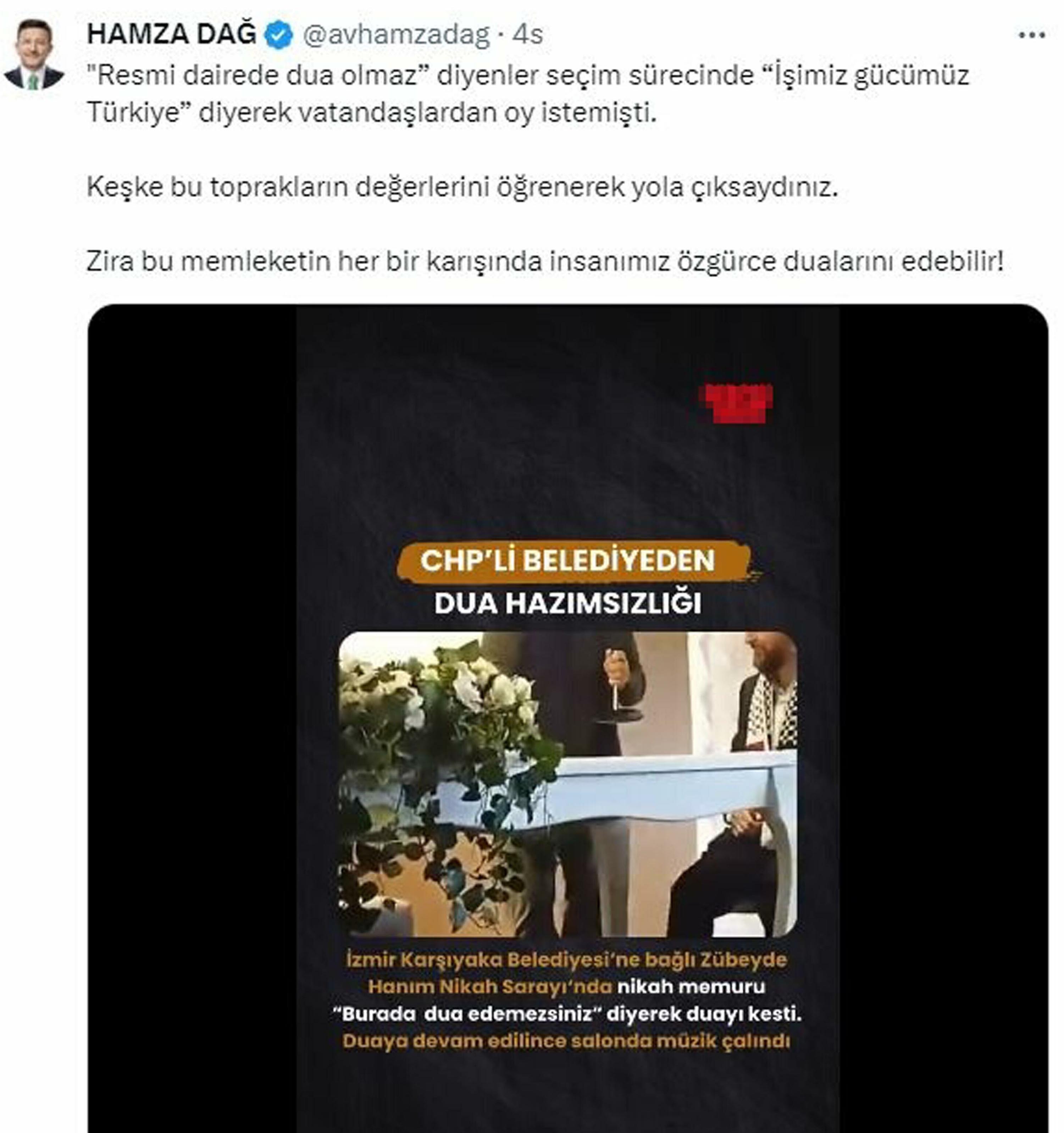 İzmir'in Karşıyaka ilçesinde, nikaha katılan bir kişinin tören öncesi dua etmek istemesinin nikah memuru tarafından engellenmesi tartışmalara neden oldu. AK Parti Genel Başkan Yardımcısı Hamza Dağ, o anların görüntüsünü sosyal medya hesabından "’Resmi dairede dua olmaz' diyenler, seçim sürecinde 'işimiz gücümüz Türkiye' diyerek vatandaşlardan oy istemişti. Keşke bu toprakların değerlerini öğrenerek yola çıksaydınız. Zira bu memleketin her bir karışında insanımız özgürce dualarını edebilir" notuyla paylaştı.