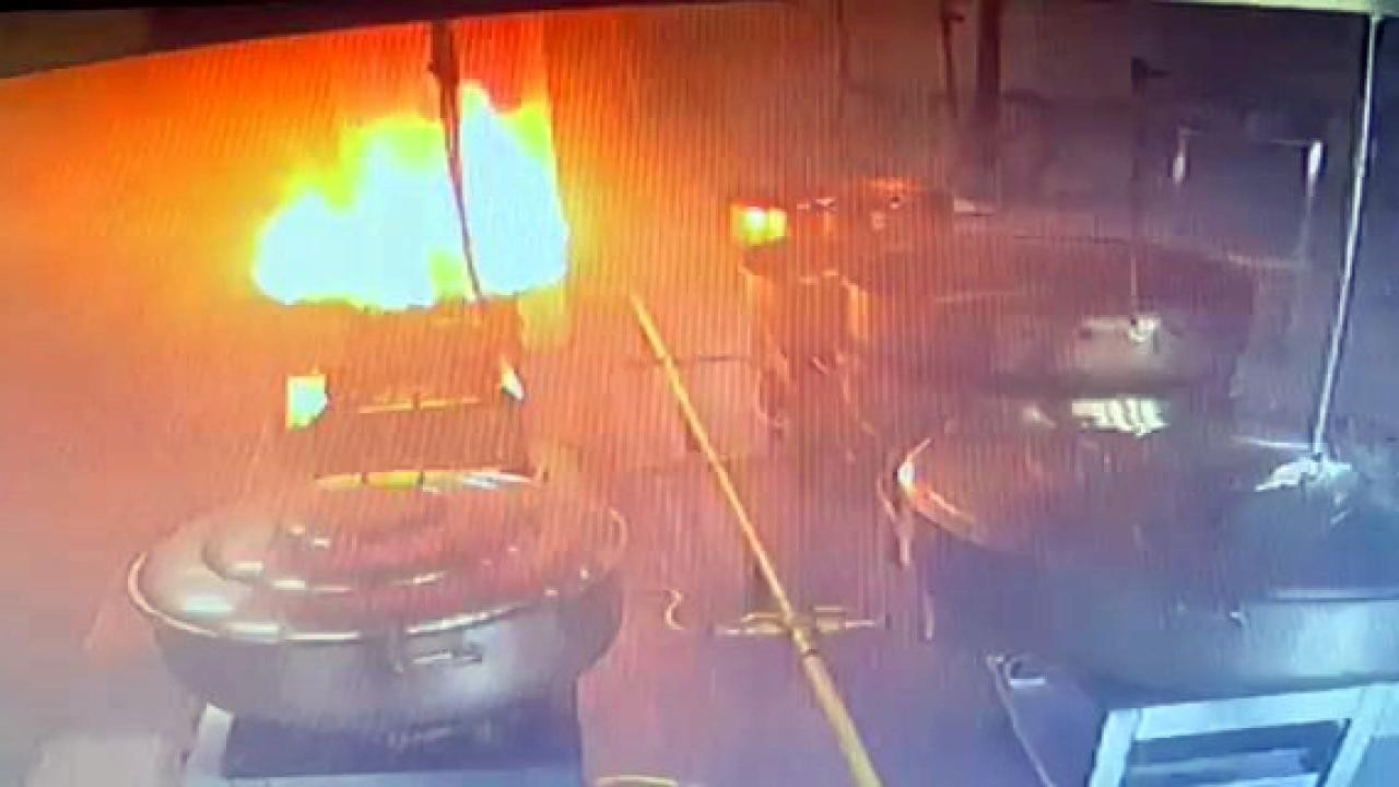 Ocaktaki tencerede kızartma yapan bir çalışan, kapağı kapayıp ayrıldı. Bir süre sonra tencereden önce dumanlar yükseldi ardından tencere alev aldı.
