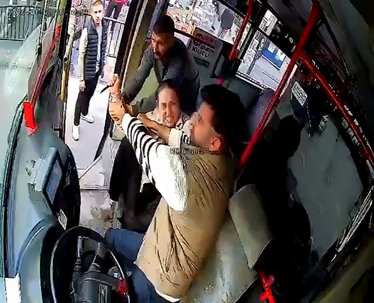 Adana'da ayrı yaşadığı Mehmet A.'nın (26) kullandığı özel halk otobüsüne binen Sabriye A. (26), 2,5 yaşındaki oğlunu gizlediği iddiasıyla eşine biber gazı sıkıp, kolunu ısırdıktan sonra boynundan bıçaklayıp, kaçtı. Araç kamerasına yansıyan olayın ardından yakalanan Sabriye A. hakkında ev hapsi kararı verildi. Kullandığı otobüsle hastaneye giden Mehmet A.'nın ise hayati tehlikesinin bulunmadığı bildirildi.
