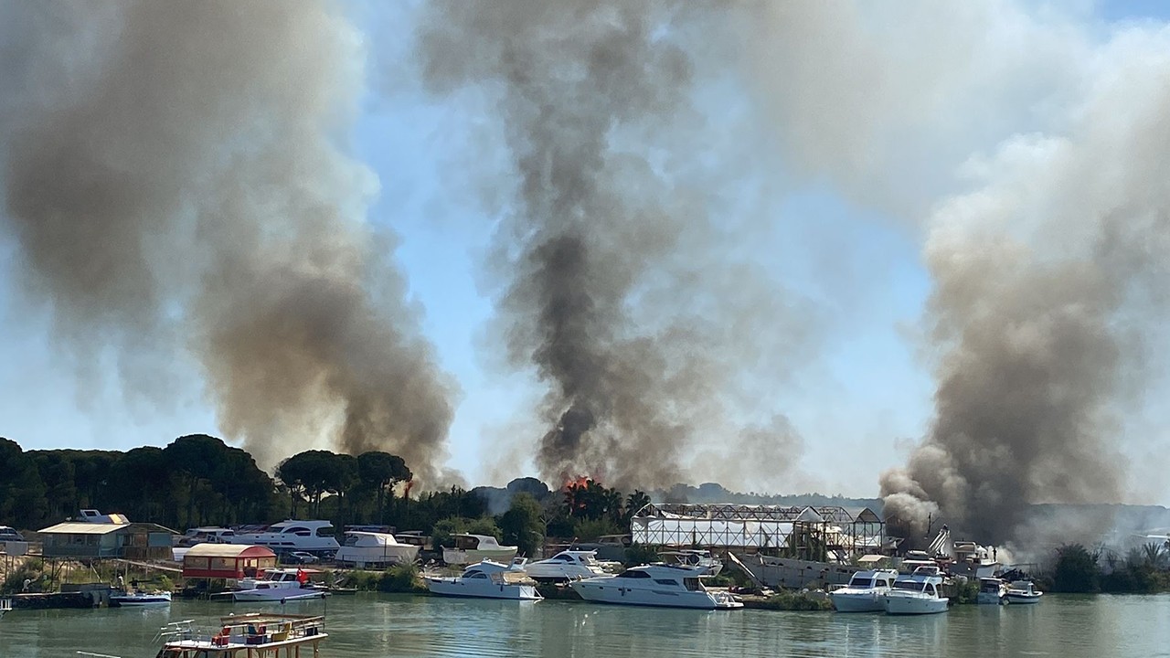 Antalya'nın Aksu ilçesinde otluk bölgede çıkan yangın, tersane ve ormanlık alana sıçradı.