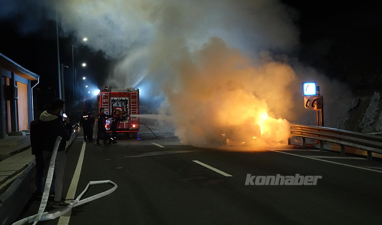 Durumu fark eden Dayan, aracını sağ şeride çekerek park etti.Bölgeye çağrılan itfaiye ekipleri, zaman zaman patlamaların da meydana geldiği araçtaki yangını söndürdü.Yangında otomobil, kullanılamaz hale geldi.