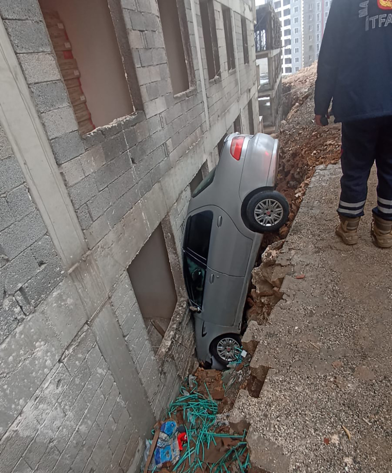 Mardin'in Artuklu ilçesinde, sürücüsün kontrolünü yitirdiği otomobil, inşaat halindeki bina ile istinat duvarı arasındaki boşluğa düştü. Kazada otomobilde hasar oluştu.