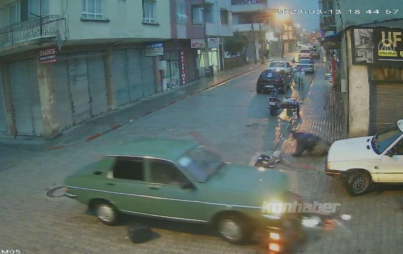 Motosikleti kullanan kişi, çarpışmanın etkisiyle kaldırıma savruldu. Aracından inen otomobilin sürücüsü de yanına gittiği motosikletliyi sarılarak teselli etmeye çalıştı.