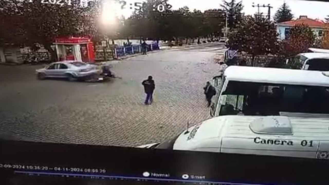 Olay, Bolvadin ilçesine bağlı Dişli beldesinde 4 Kasım günü meydana geldi. Edinilen bilgilere göre, U.K. (17) idaresindeki 03 AGG 257 plakalı motosiklet henüz belirlenemeyen bir sebepten ötürü sürücüsünün direksiyon hakimiyetini kaybetmesi sonucu kontrolden çıktı. Savrulan motosiklet daha sonra O.G.'nin kullandığı 48 NK 848 plakalı araca çarptı. Çarpmanın etkisi ile U.K., yaklaşık 10 metre sürüklendi. Çevredekilerin haber vermesi üzerine bölgeye jandarma ve sağlık ekibi sevk edildi. Ekipler U.K.'yi ambulansla Bolvadin Devlet Hastanesi'ne kaldırdı. Motosikletlinin şans eseri hafif yaralı atlattığı kaza anı ise güvenlik kameralarına yansıdı.