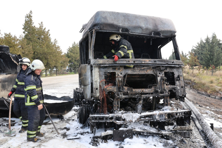 Jandarma ekiplerinin yolu trafiğe kapatarak güvenlik önlemi almasının ardından itfaiye ekipleri, 10 tanker ve 8 arazözle yanan araca müdahalede bulundu. Tankerdeki yangın ekiplerin çalışmasıyla söndürüldü.