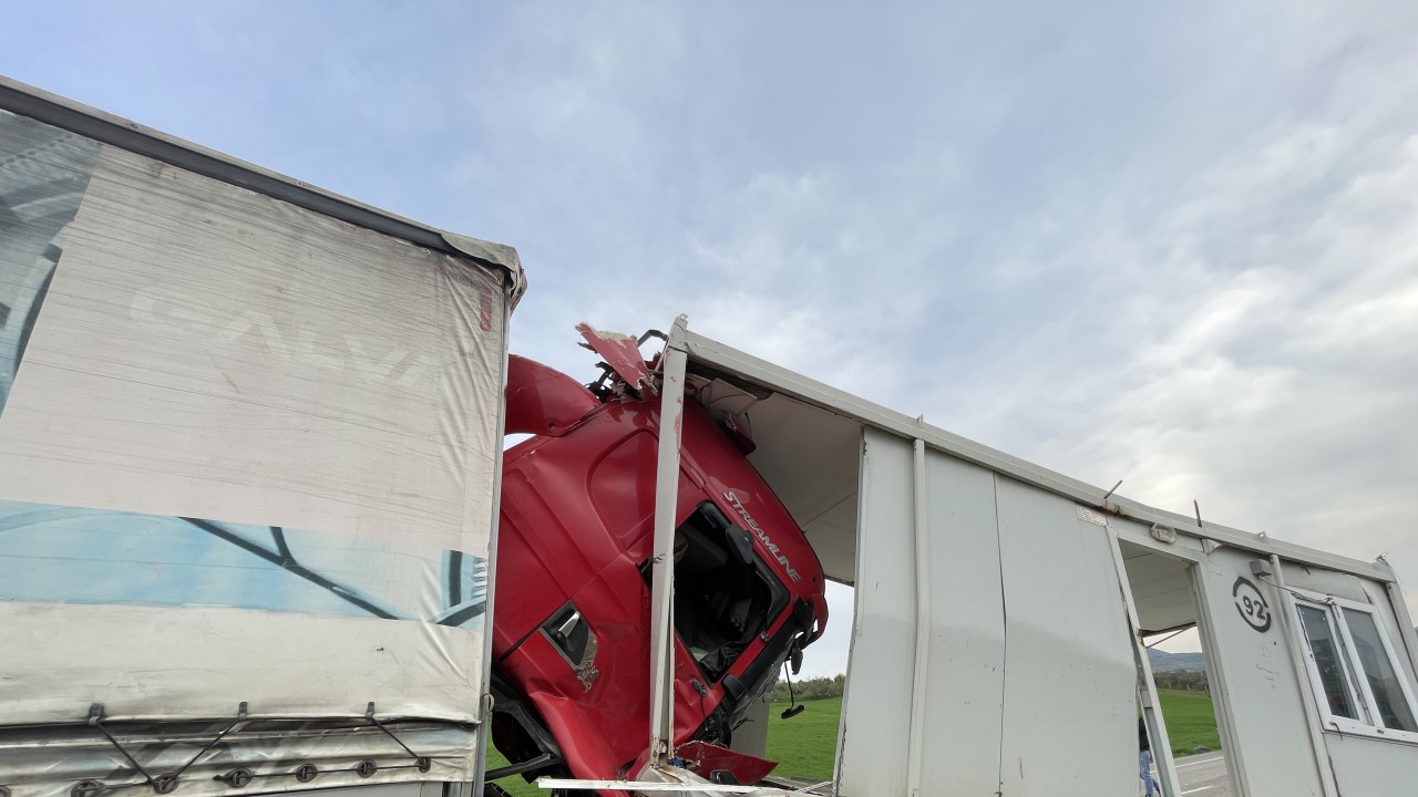 Çarpmanın şiddetiyle tırın ön kısmı, konteynerlerin içine girdi.