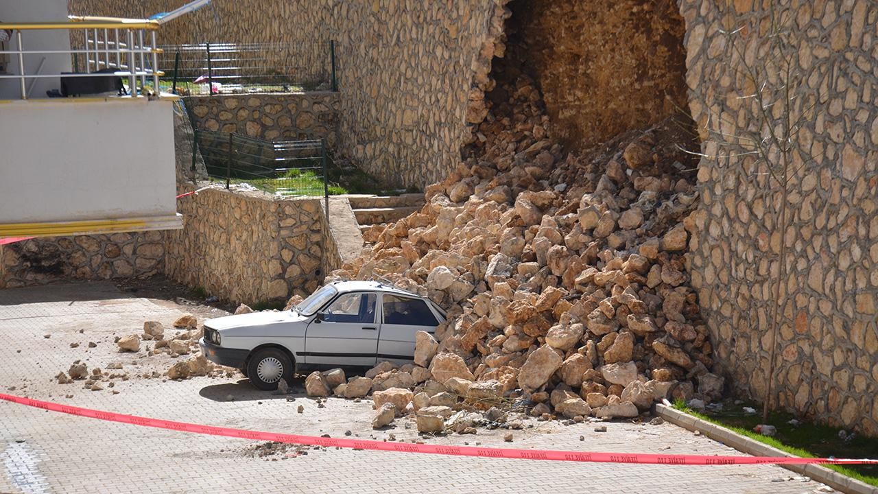 Adıyaman'ın Besni ilçesinde bir binanın istinat duvarı yıkıldı. Park halindeki otomobilde maddi hasar oluşurken ekipler bölgeyi güvenlik şeridiyle kapattı.
