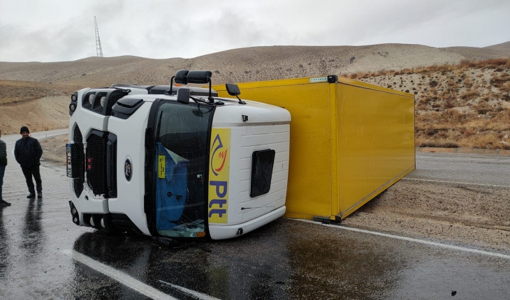 Sivas’ın Gürün ilçesinde PTT kargoya ait kamyon devrildi, yedek sürücü yaralandı.