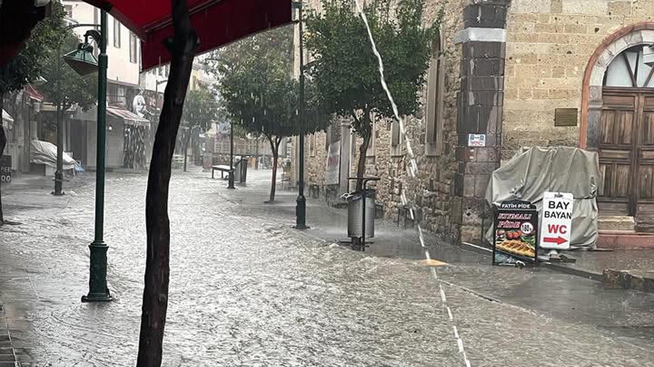 Masa ve sandalyeler akıntıya kapılıp sürüklendi. İlçede hayatı olumsuz etkileyen sağanak yağışın devam ettiği öğrenildi.