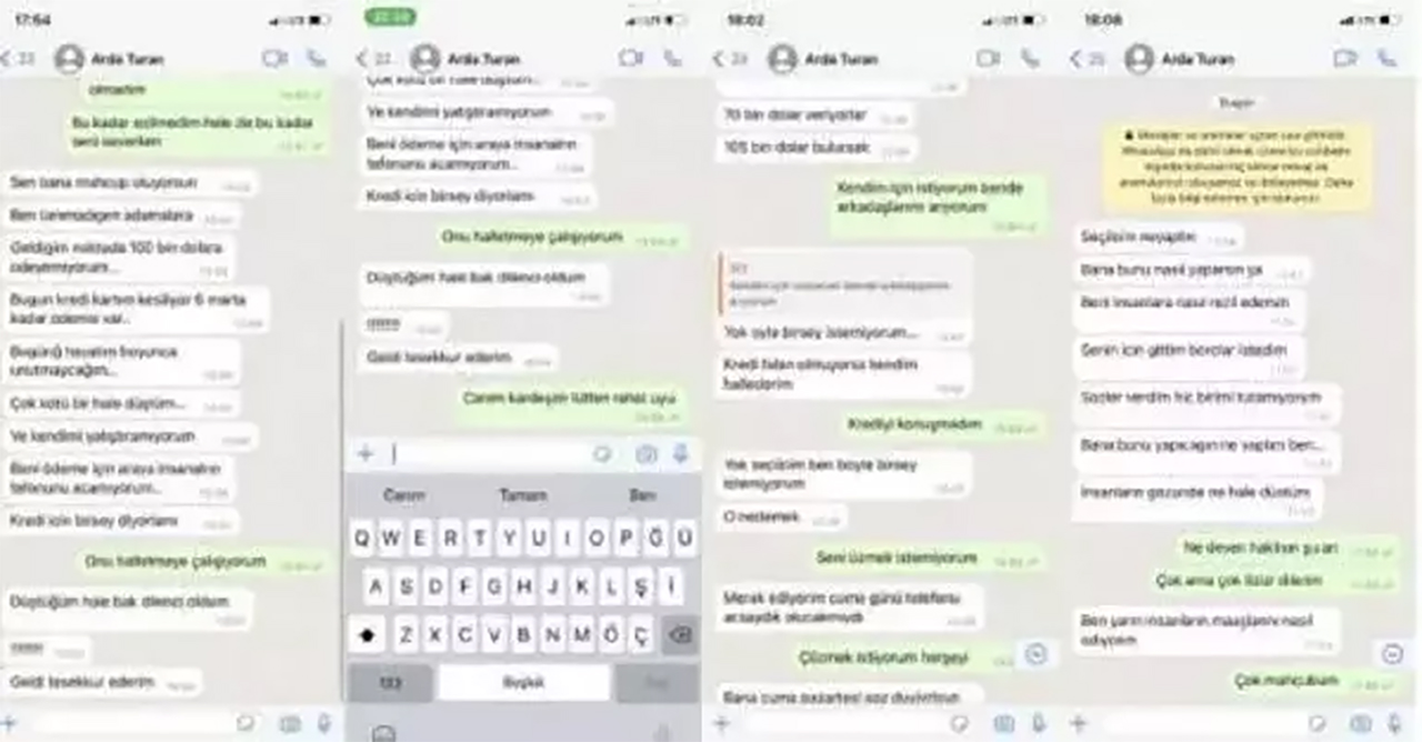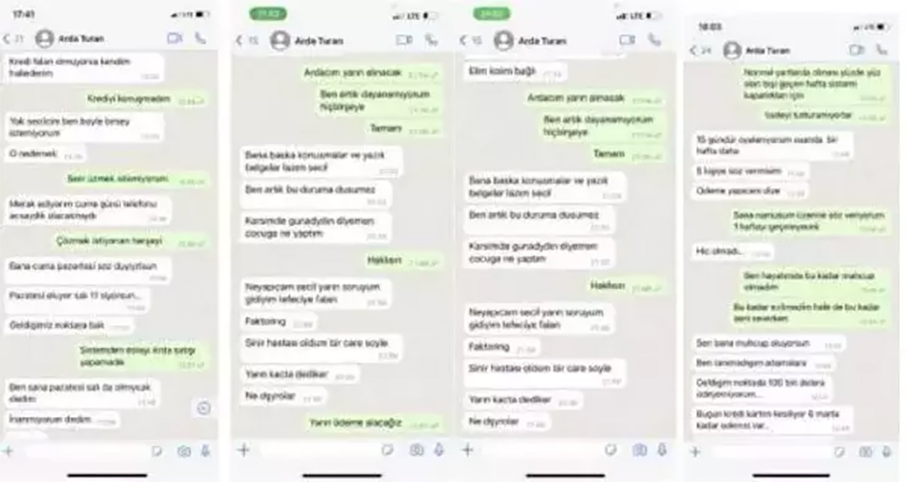 Seçil Erzan'ın Arda Turan ile arasındaki mesajlaşmalar da bilirkişi raporunda yer aldı. Arda Turan'ın, "Seçil'cim ne yaptın, bunu bana nasıl yaparsın, senin için gittim borçlar istedim, sözler verdim hiçbirini tutamıyorum. İnsanların gözünde ne hale düştüm. Ben yarın insanların maaşlarını nasıl ödeyeceğim" diye yazdığı Seçil Erzan ise "Çok mahcubum" Cevabını yazdığı görülüyor. Konuşmaların devamında Arda Turan'ın, "Ne yapacağım Seçil, yarın gideyim sorayım tefeciye falan. Faktoring. Sinir hastası oldum bir çare söyle. Yarın kaçta dediler, ne diyorlar?" dediği, Erzan'ın, "Yarın ödeme alacağız. Normal şartlarda olması yüzde 100 olan bir şey geçen hafta sistemi kapattıkları için vadeyi tutturamıyorlar" şeklinde yanıt verdiği görülüyor.