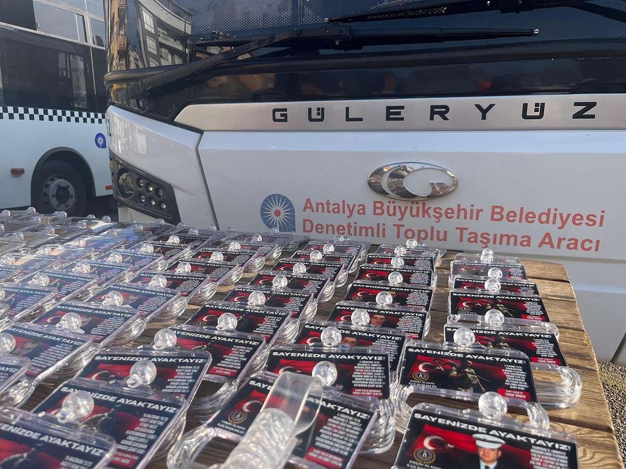 Antalya'nın Alanya ilçesinde, şehit asker ve polislerin fotoğrafları ile bilgilerinin yer aldığı özel kartlar ve görseller otobüs tutamaçlarına basılarak 90 halk otobüsüne takıldı.