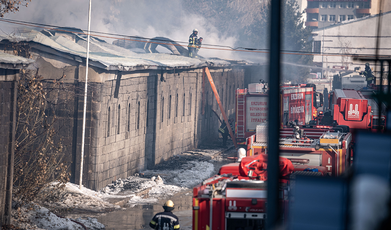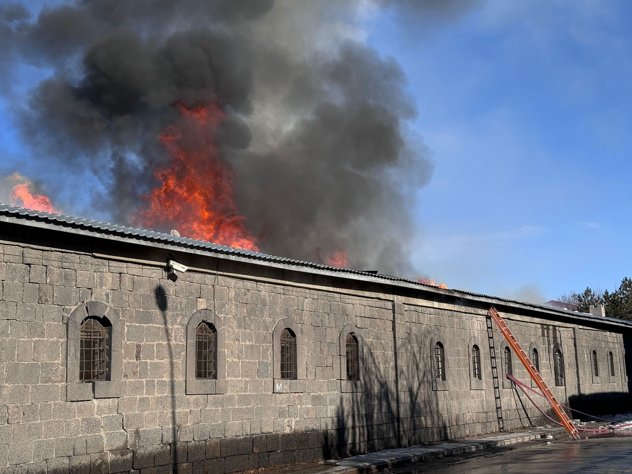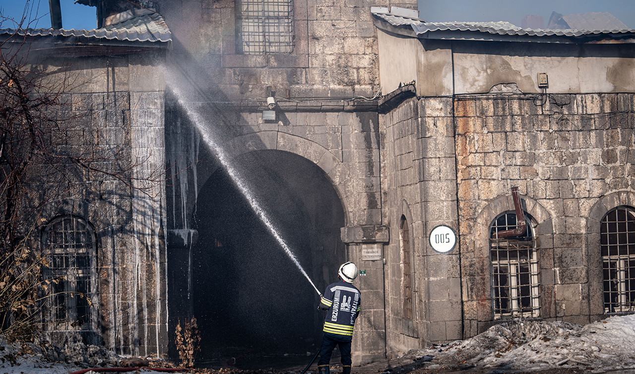 Erzurum'da 160 yıllık Taş Ambarlar'ın çatısında çıkan yangın söndürülmeye çalışılıyor.