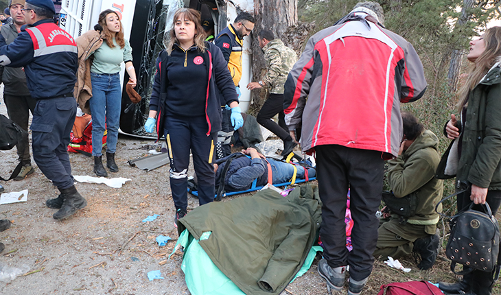 Bolu'da, Kartalkaya kayak merkezinden dönen tatilcilerin taşındığı minibüsün keskin virajda sürücüsünün kontrolünden çıkarak devrildiği kazada, araçta bulunan 19 yolcudan 14'ü yaralandı.