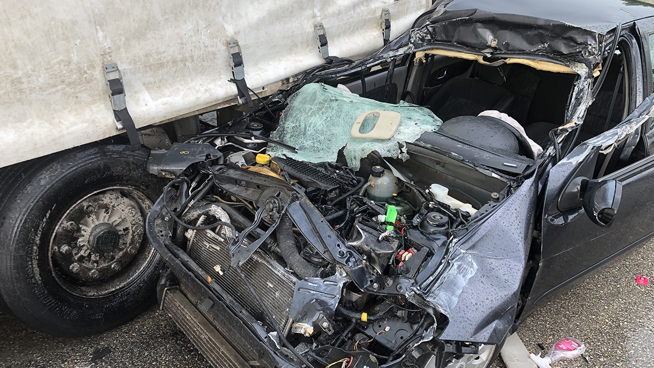 Bursa'nın Nilüfer ilçesinde, tıra arkadan çarpıp altına giren otomobildeki 2 kişi ağır yaralandı.