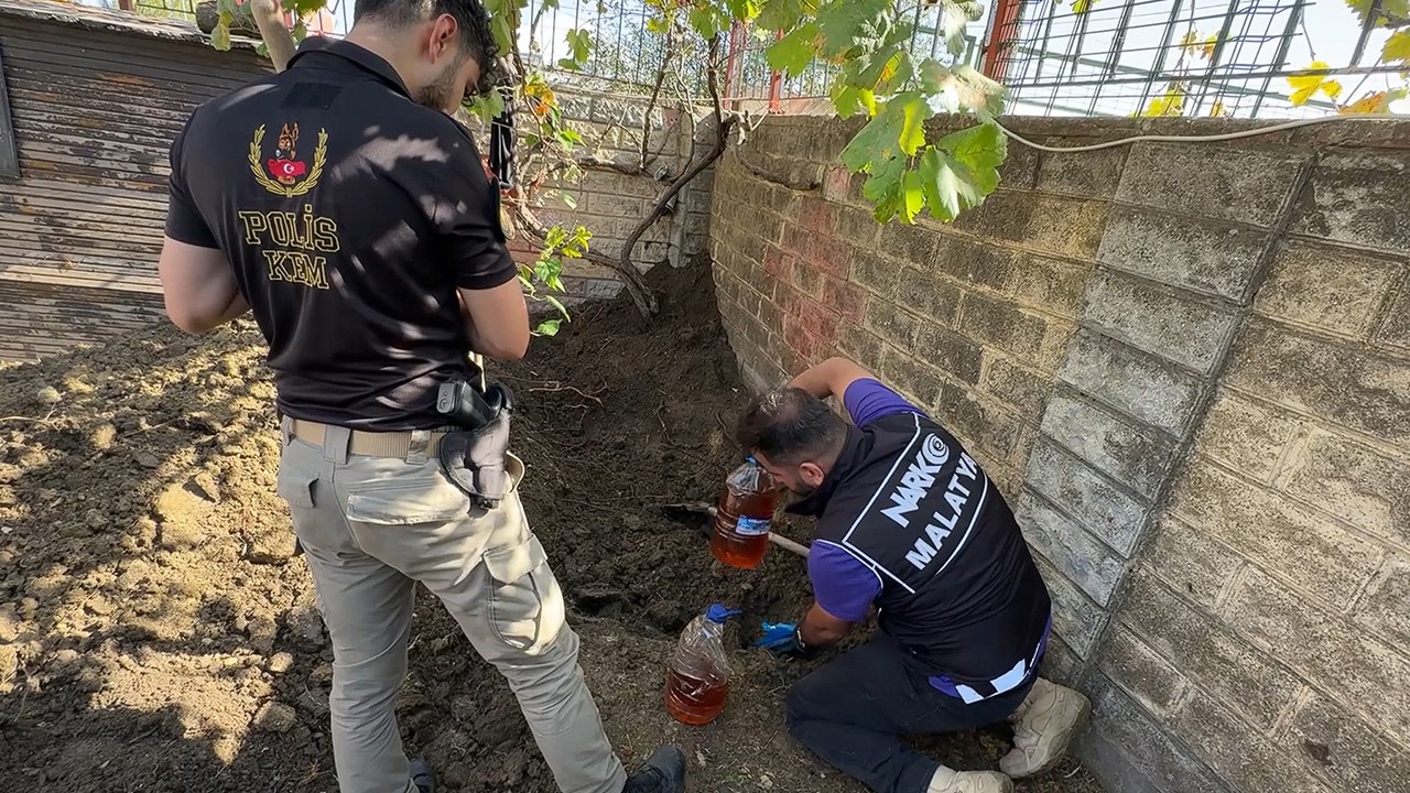Malatya'da merkezli soruşturma kapsamında İstanbul'daki bir adreste yapılan aramada, toprağa gömülü, piyasa değeri 10 milyon TL olan 7 kilo 450 gram sıvı metamfetamin ele geçirildi.