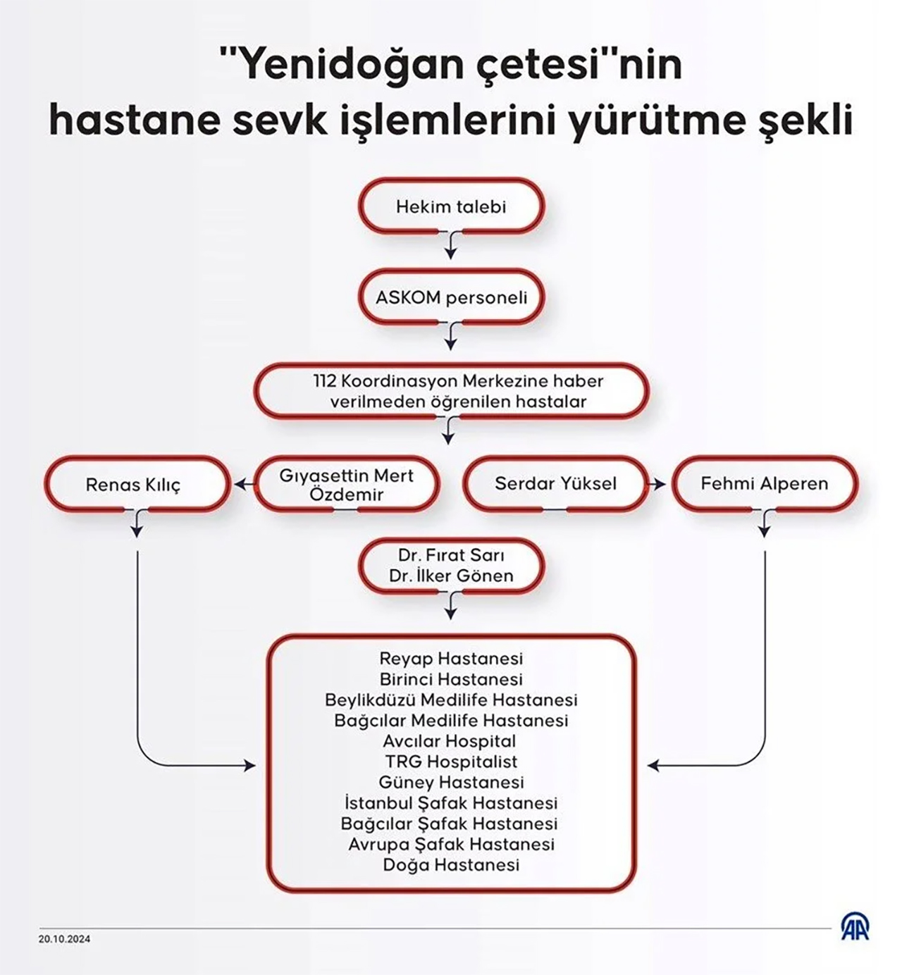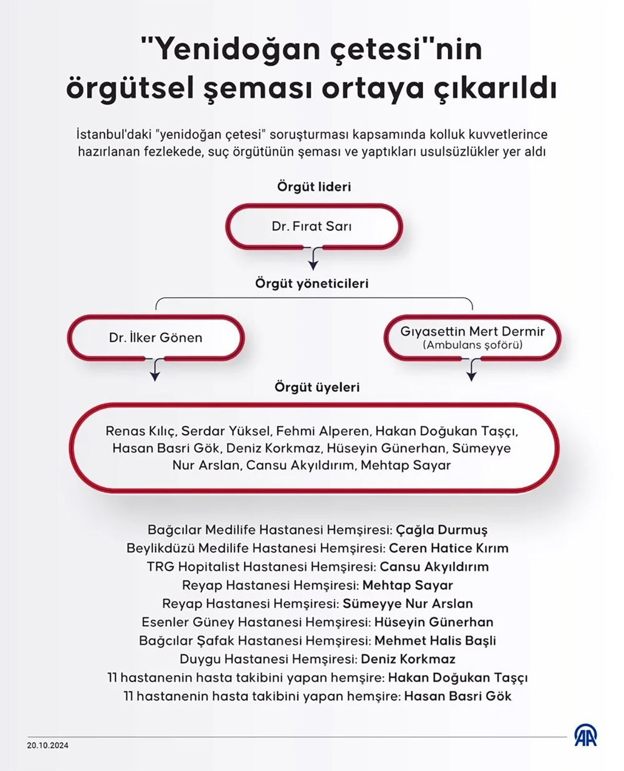 Yenidoğan çetesine ilişkin soruşturmada ilk tutuklamalar 22 Nisan 2024 tarihinde yapıldı. 22 kişi tutuklanarak cezaevine konuldu.